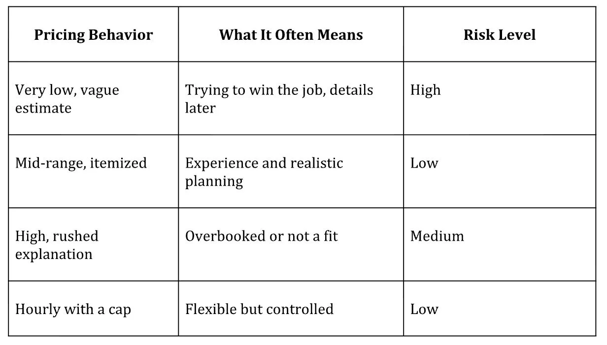 Price alone doesn’t predict quality, but patterns matter. Here’s a quick comparison to help you interpret quotes.
